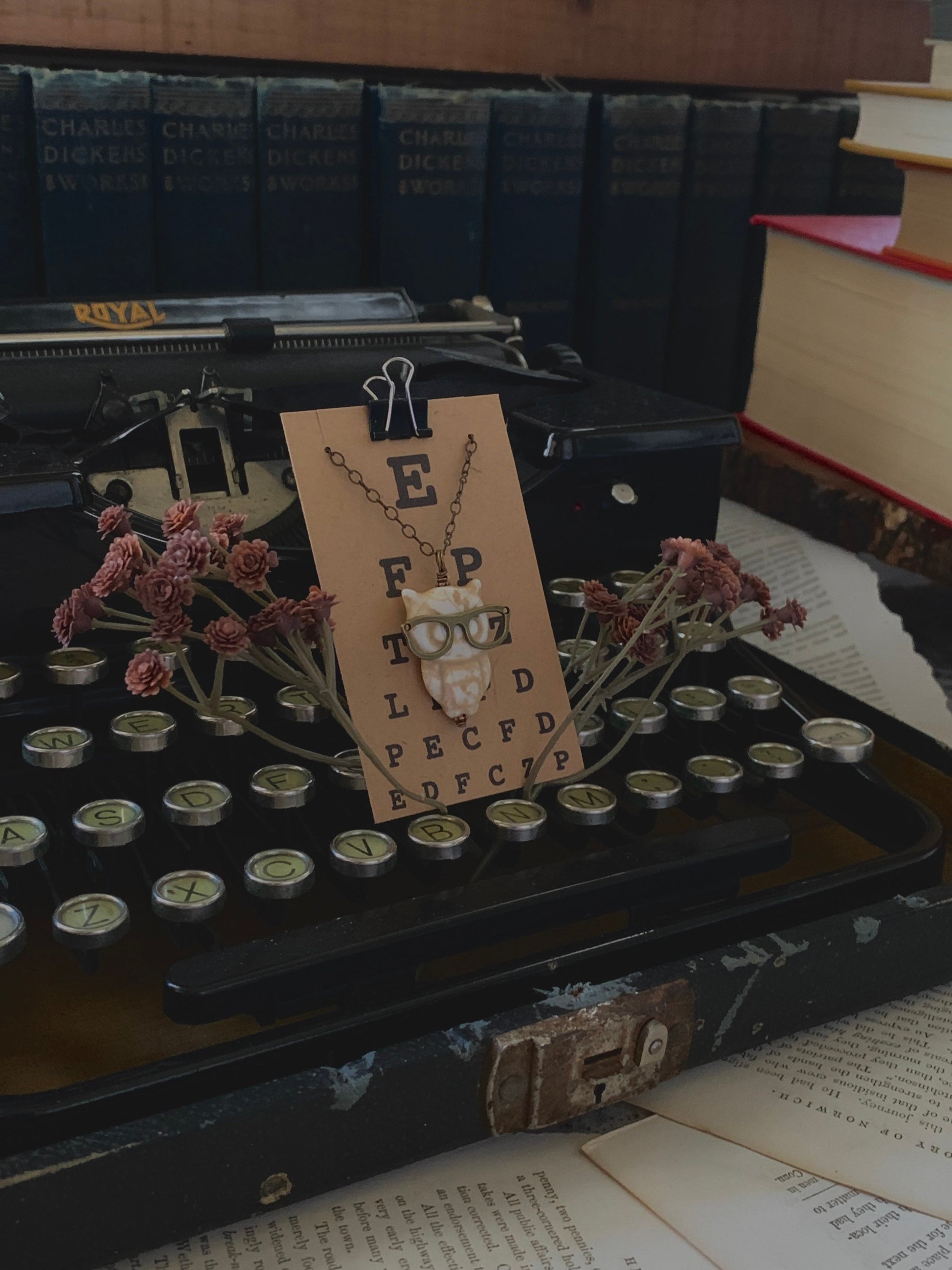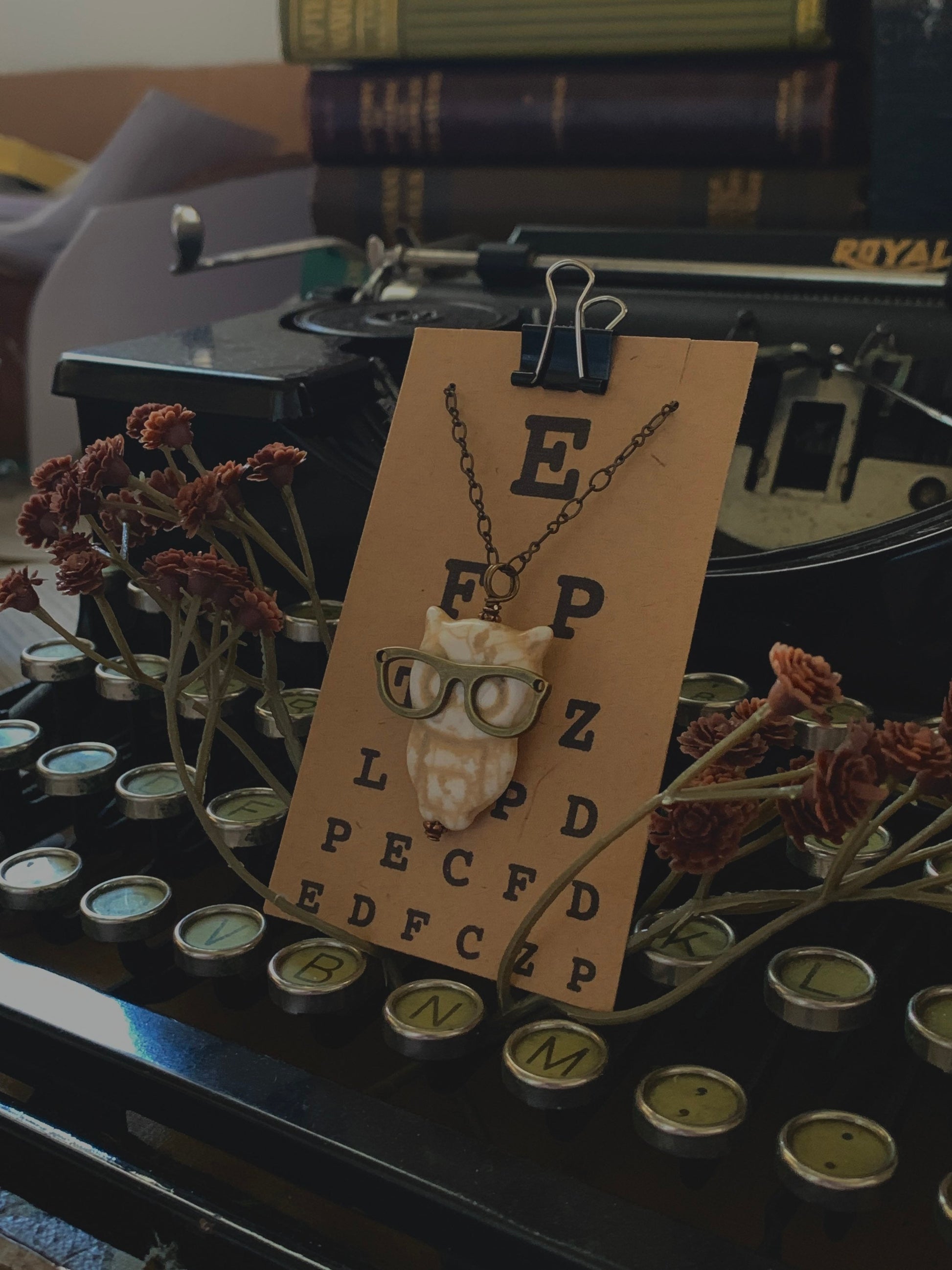 • This necklace features a medium sized ivory coloured owl pendant with a pair of bronze glasses on. The owl pendant feels sort of like a rock, but isn't really.