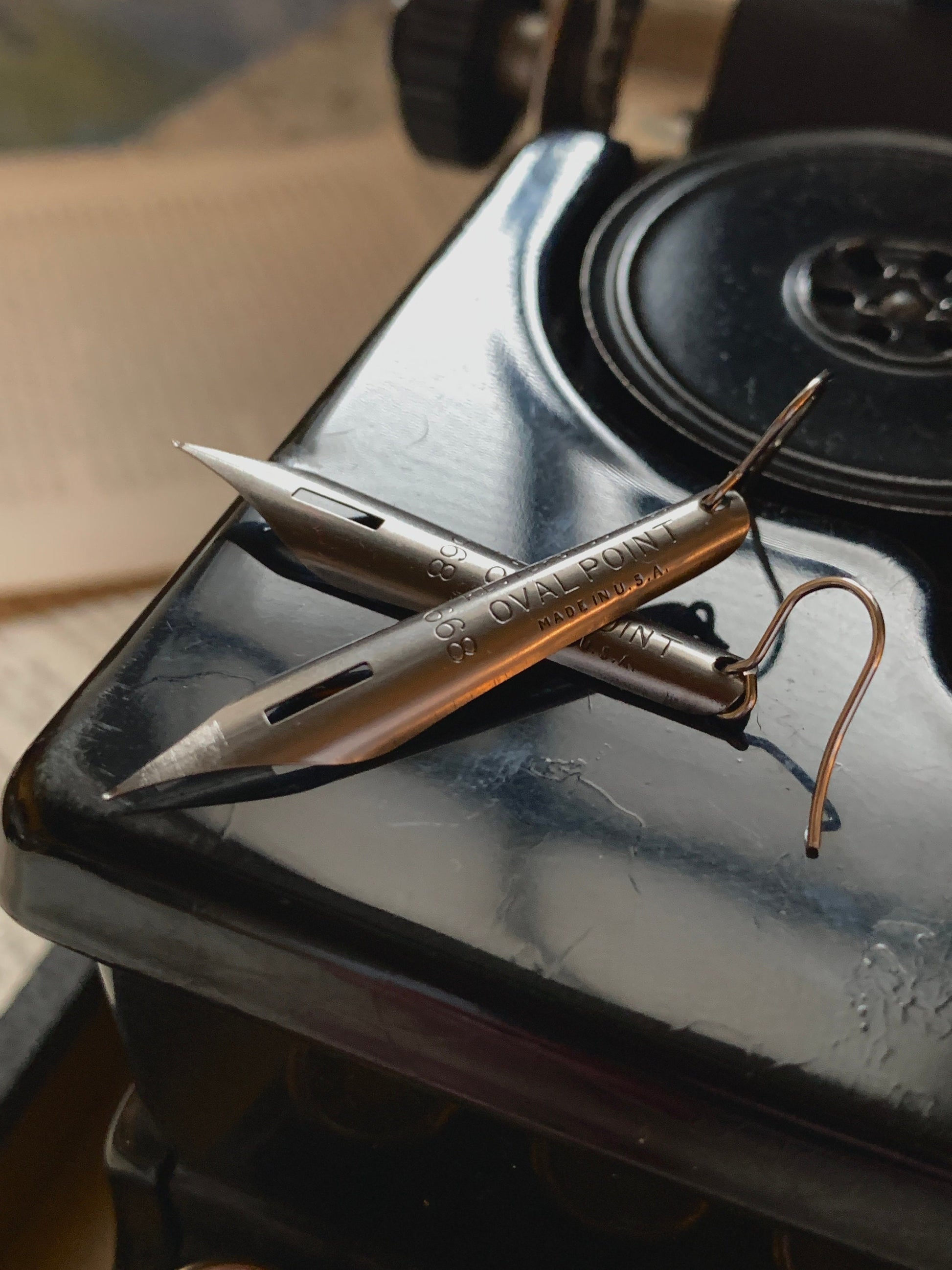 These vintage earrings are crafted from authentic R. Esterbrook pen nibs in light gunmetal, stamped with “OVAL POINT,” “Made in USA,” and “668.” Once used for writing, the nibs now serve as refined accessories, carrying the legacy of the past.